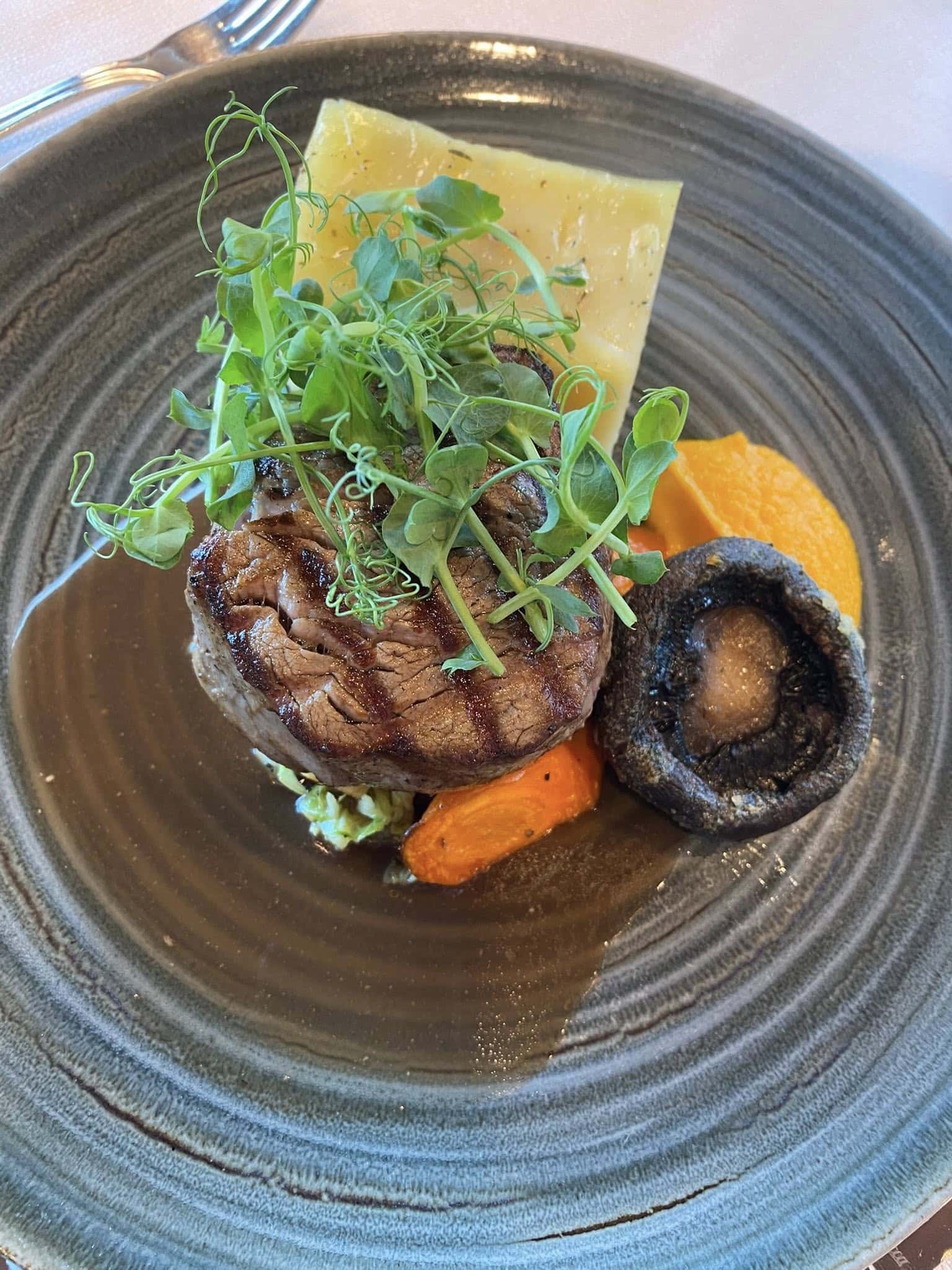 Med portobellosvamp – krydderbagte rodfrugter – gulerodspuré