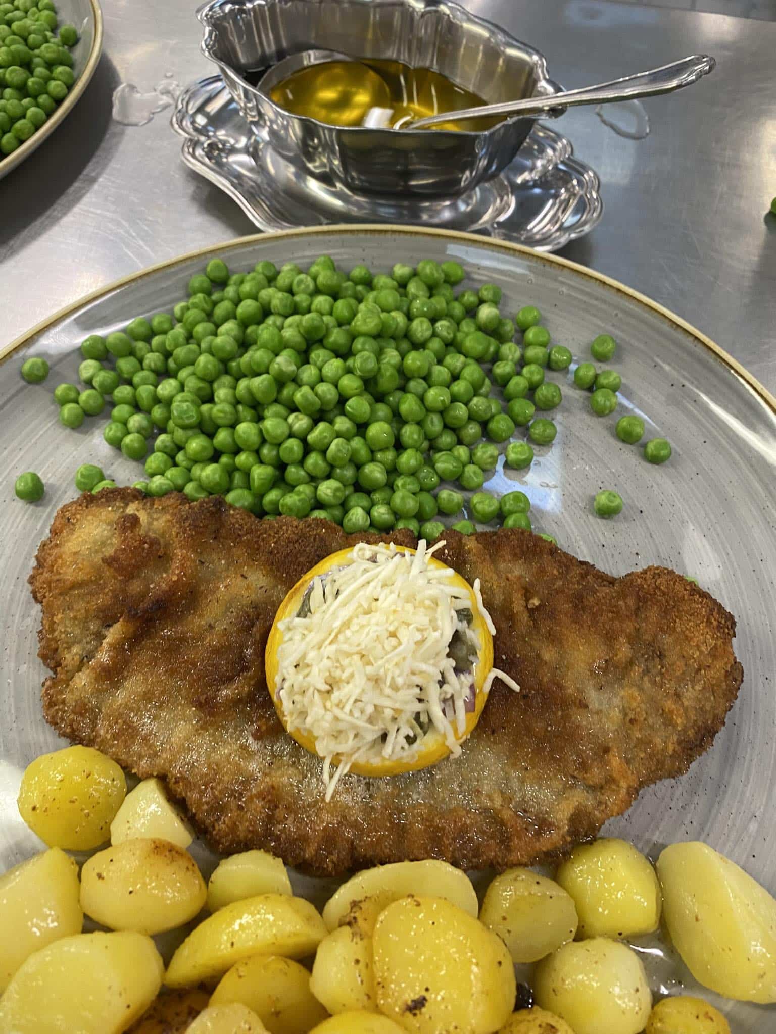 Onsdags schnitzel Hver Onsdag Vi er klar fra kl 17,30 Tilbydes vores klassiske wienerschnitzelMed 100 kroners rabat Klassisk Wienerschnitzel af kalv Pommes Sauté – ærter – smørsauce – wienerdrengKun 168,00